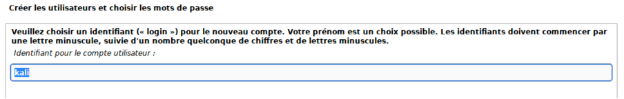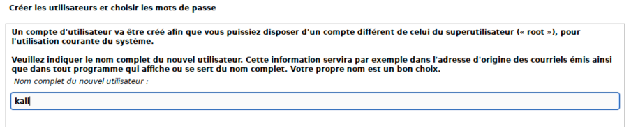 Passons désormais à la création d’un utilisateur. Dans mon cas j’ai pour habitude de mettre des login/mdp simple et intuitif. Je donne tout d’abord le nom kali a la session