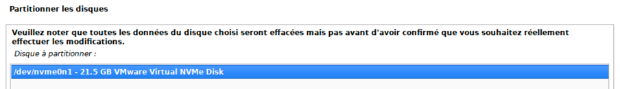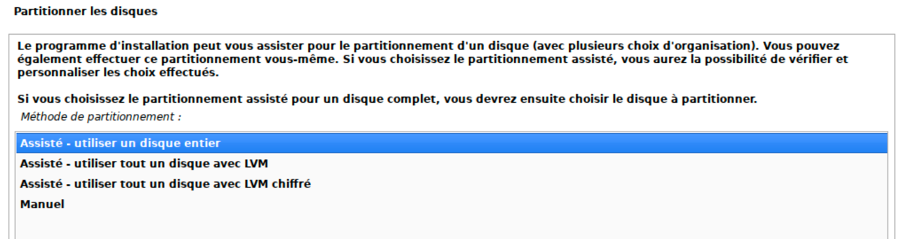 Passons ensuite a la configuration des disque et notamment a la partie partitionnement. Etant donner qu’actuellement notre disque virtuelle est vide, nous pouvons séléctionner « Assisté – utiliser un disque entier ». Dans le cadre d’une machine avec une configuration RAID Logique (Non Pysique), il serait possible de choisir la partie LVM.