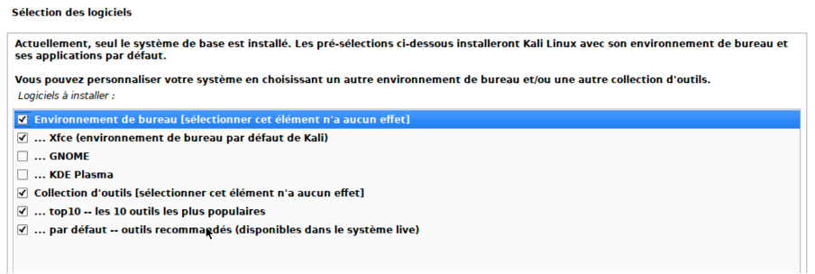Une fois cela fait, une fenêtre s’affiche et nous demande de sélectionner l’environnement de bureau et les applications qui seront installer. Selon vos envies, vous pouvez installer l’environnement de bureau qui vous convient le mieux mais il faut quand même savoir que je trouve personnellement que Kali est mieux optimiser sous Xfce.