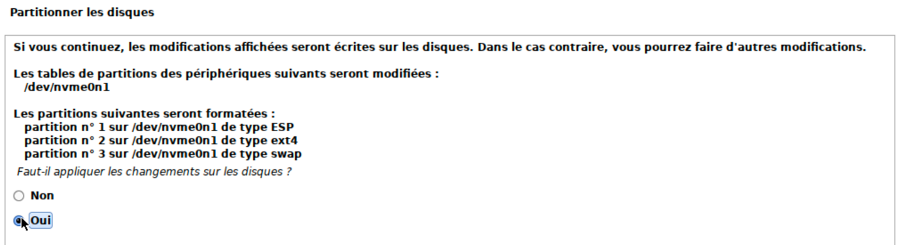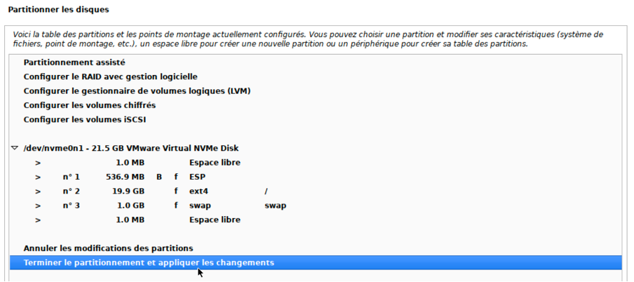 Suite à toutes ces étapes nous pouvons maintenant finir la configuration en cliquant sur « Terminer le partitionnement et appliquer les changements ».