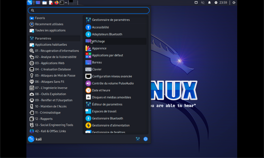 On arrive donc sur le bureau de Kali Linux et la première chose à faire comme on est sur une machine virtuelle, se rendre dans les paramètres d’affichage.