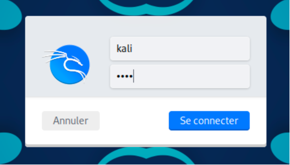 Suite à ça, nous allons arriver sur la page de connexion a Kali Linux. Nous allons donc rentrez les mots de passe que nous avons configurer précédemment dans l’installation à savoir kali : kali:kali.
