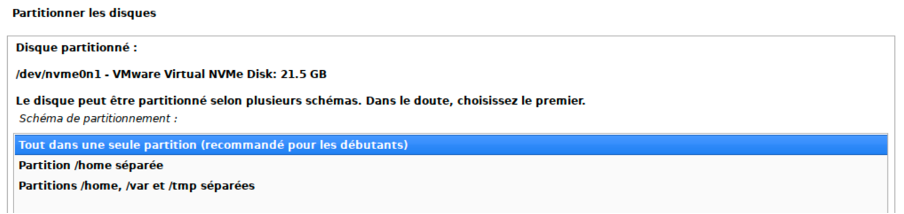 Une fois cela fait, on peut donc sélectionner « tout dans un seule partition ». Notre but dans cette procédure est de faire un machine virtuelle fonctionnelle mais pas doté d’une sécurité pointue.